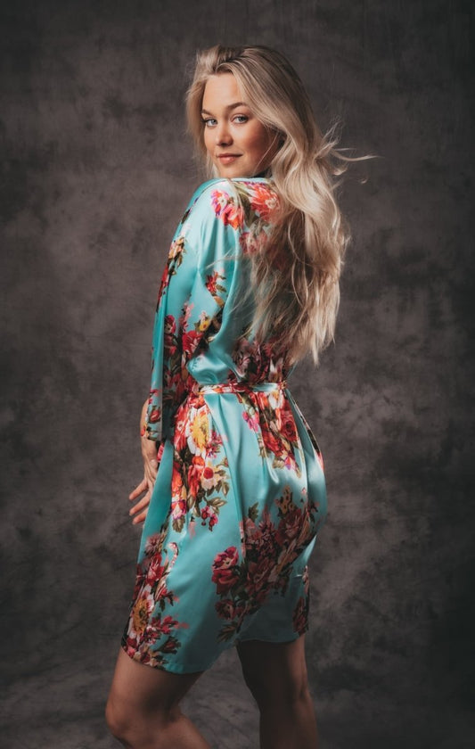 Kimono Damen Satin - Wildblumen - Kurz