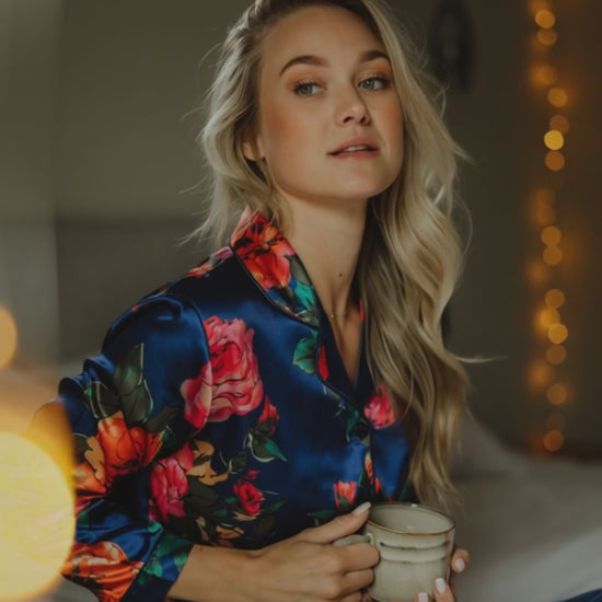 Nach dem Erfolg unseres Kimono-Satins „Santorini Wild Roses“ ist der beliebte Santorini-Print nun auch als Pyjama erhältlich. Der tiefdunkelblaue Satin, verziert mit Wildrosen in warmen Farben, verleiht diesem Pyjama einen zeitlosen und luxuriösen Look.